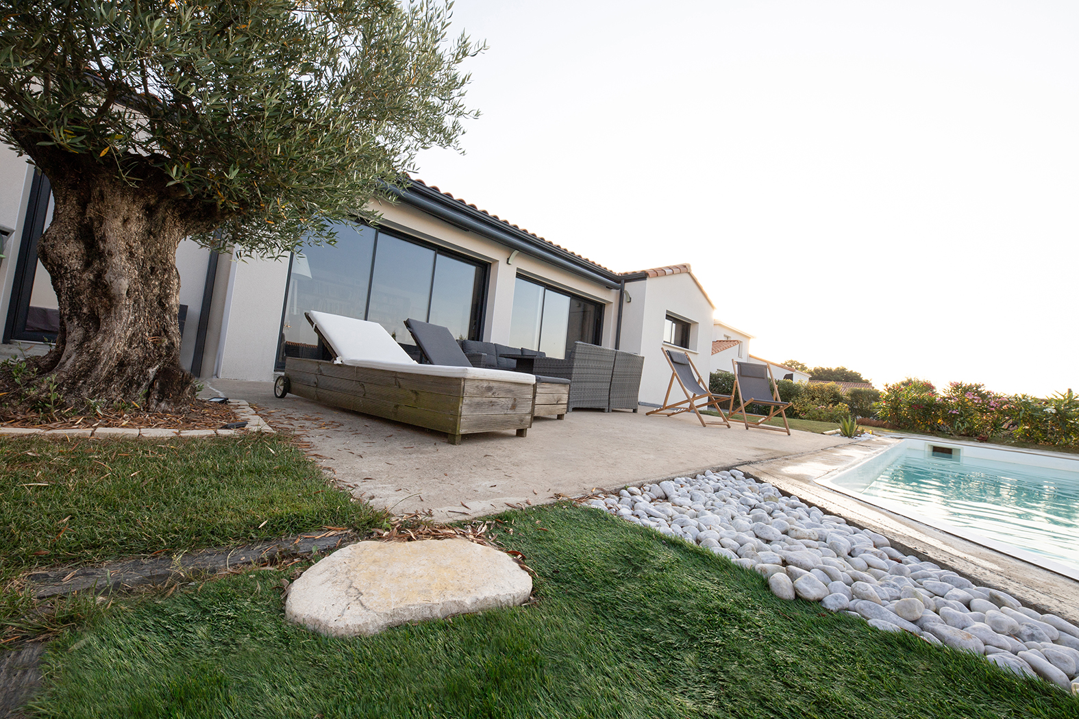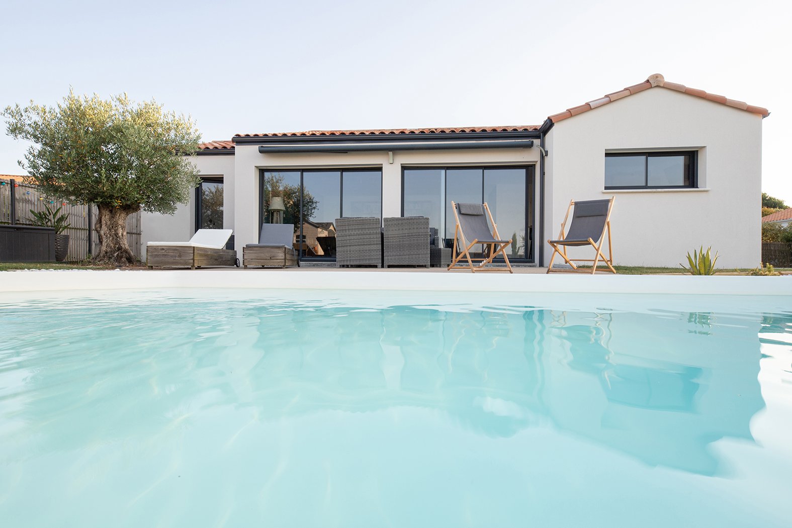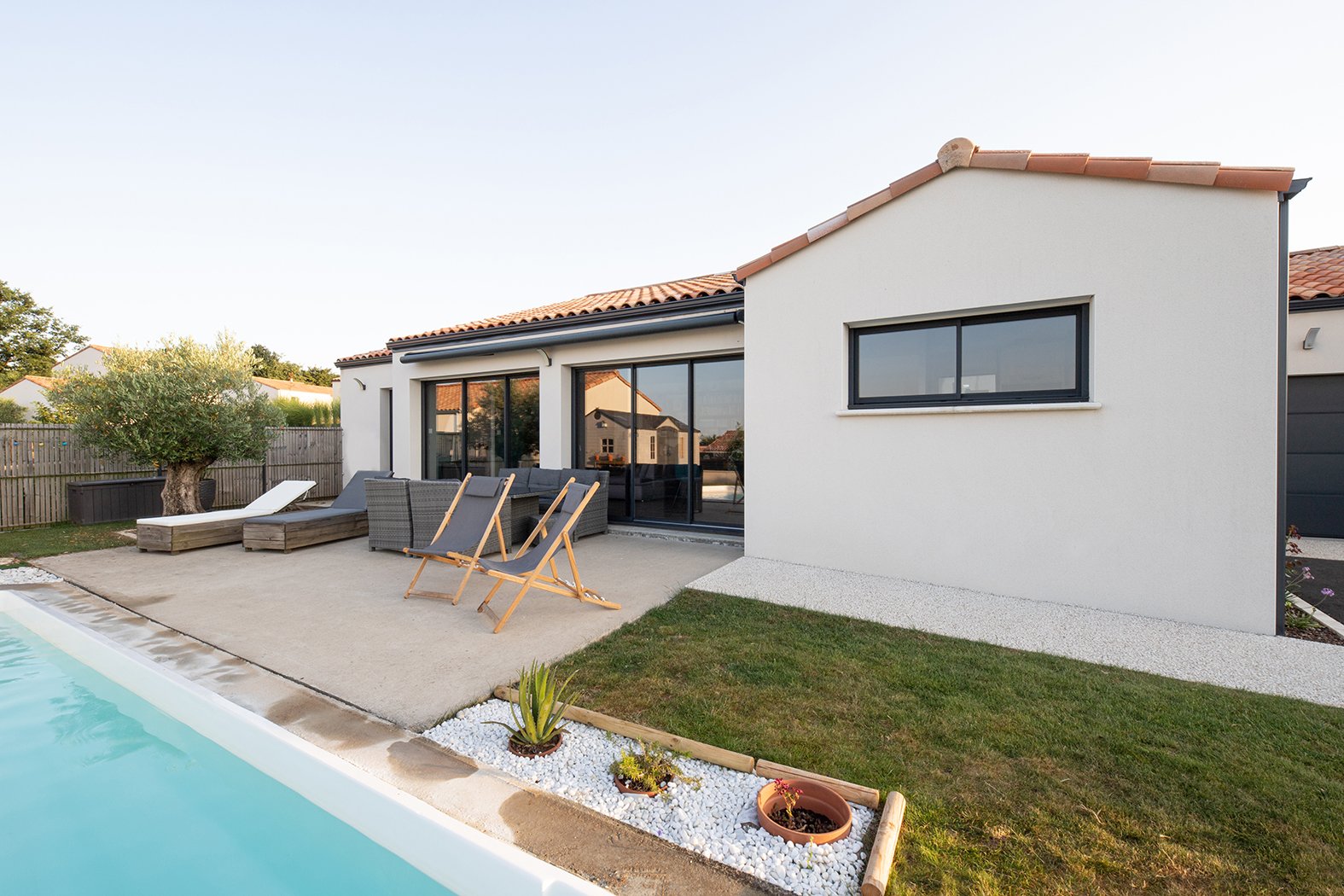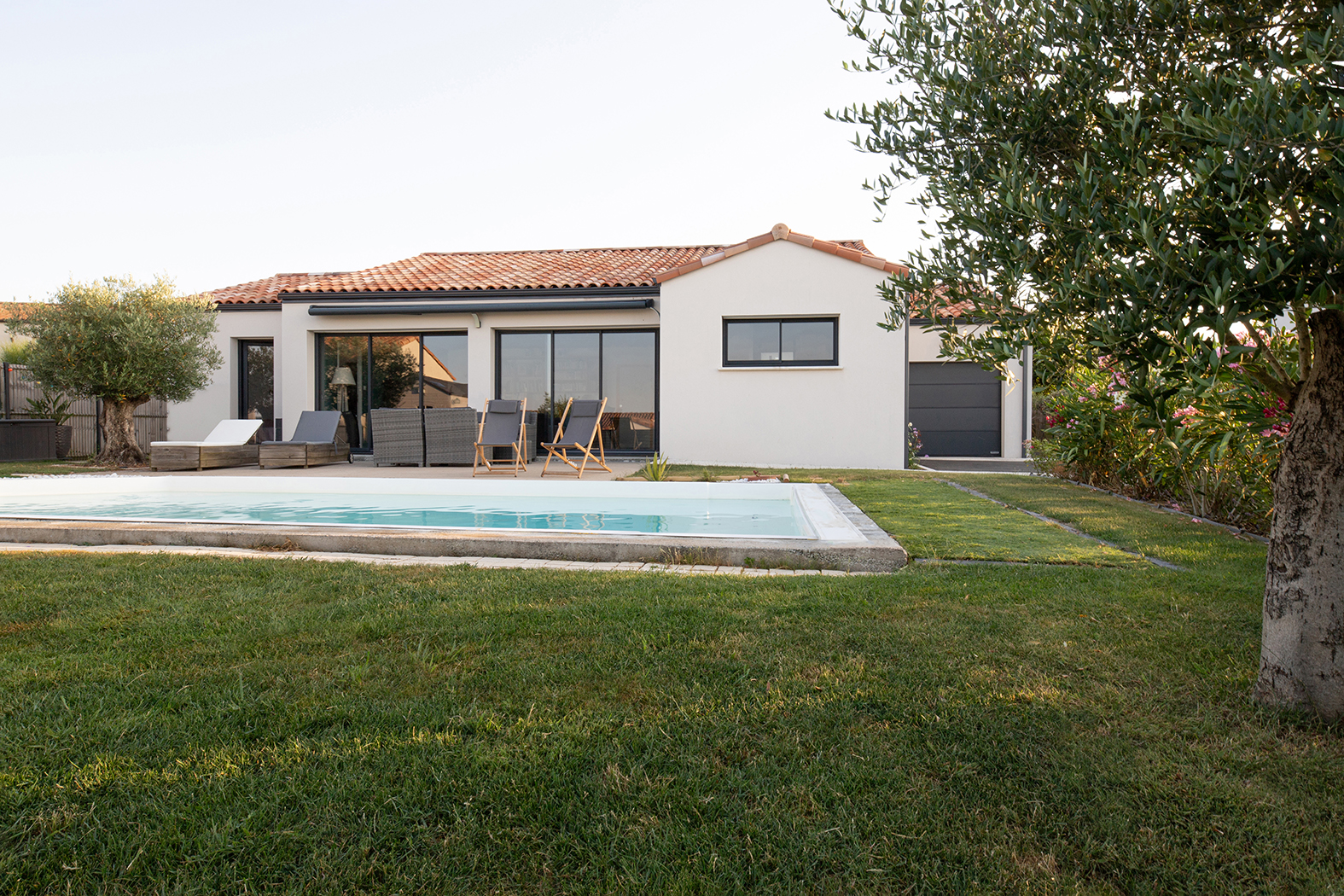 Maison de plain-pied, 4 chambres dont 1 suite parentale avec dressing, lingerie, garage de 26 m². 2 grandes baies 3 vantaux dans la pièce de vie donnent sur la terrasse, face à la piscine.