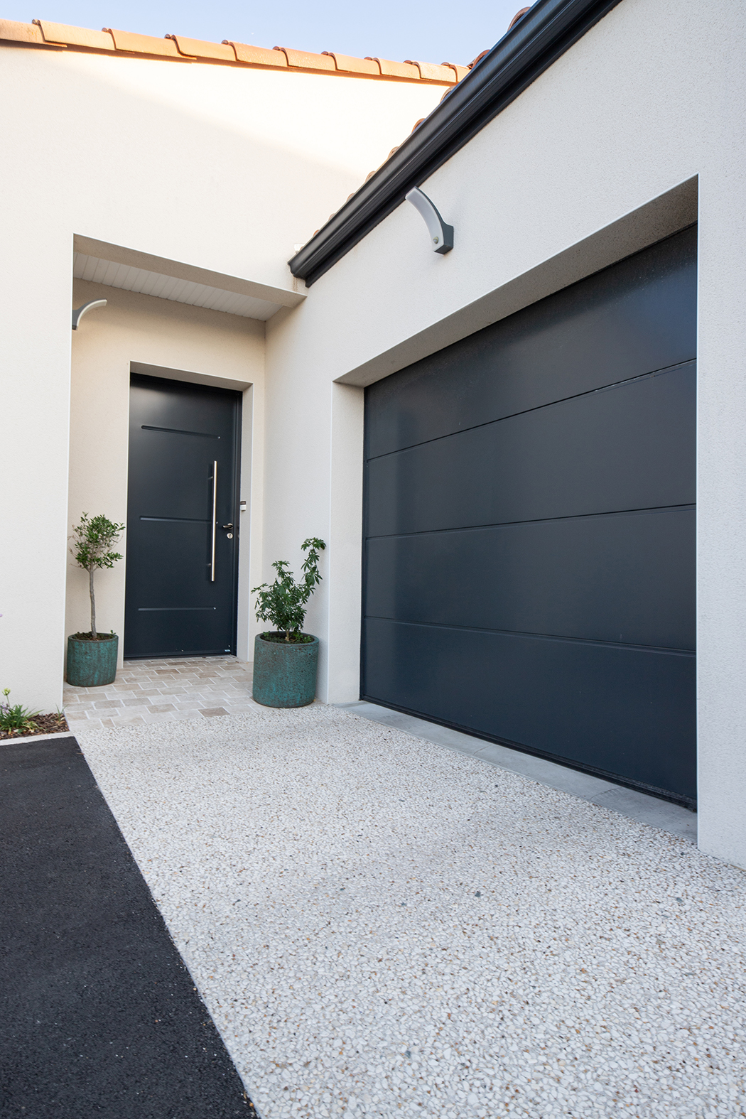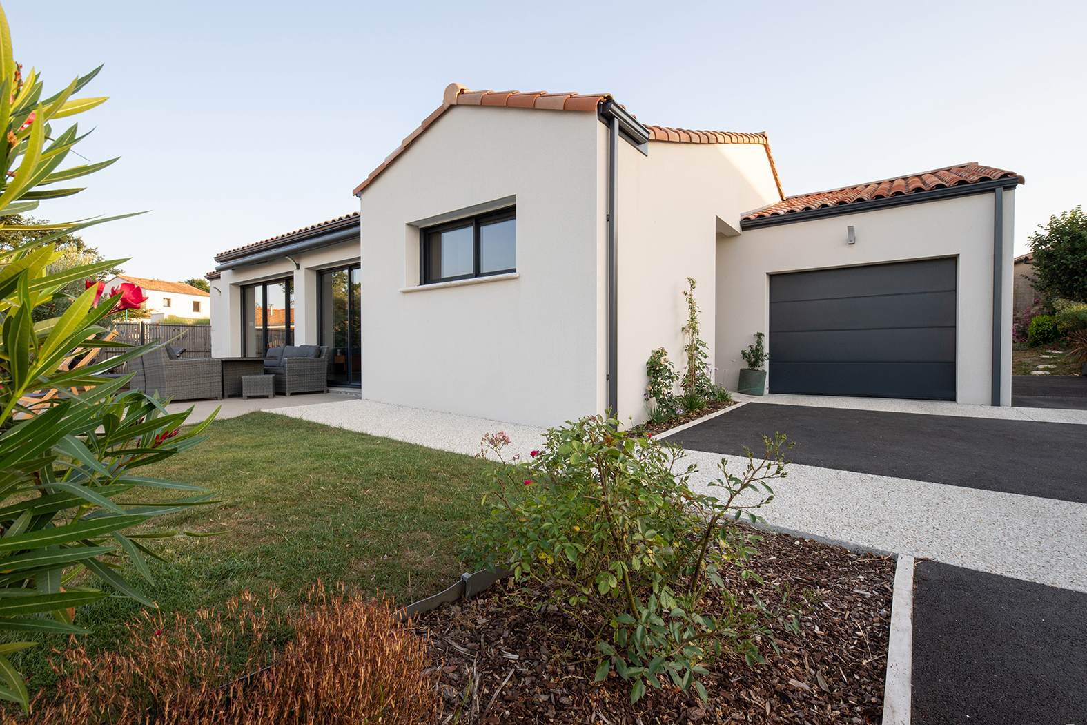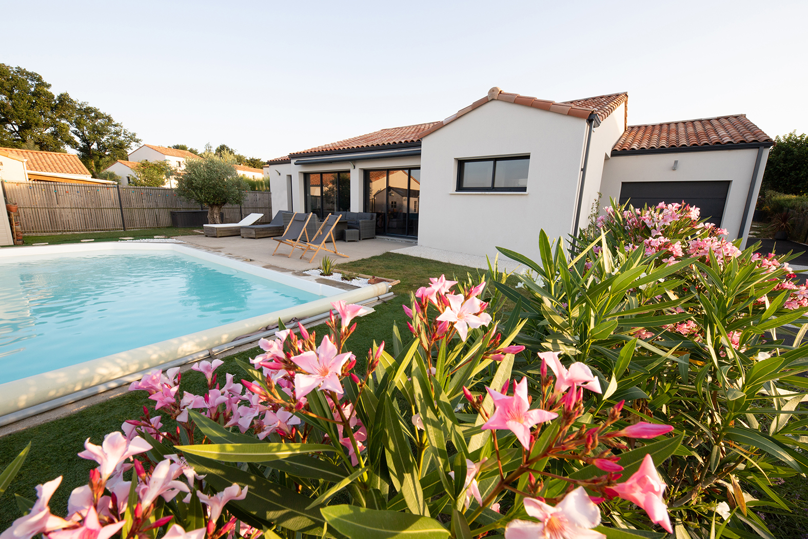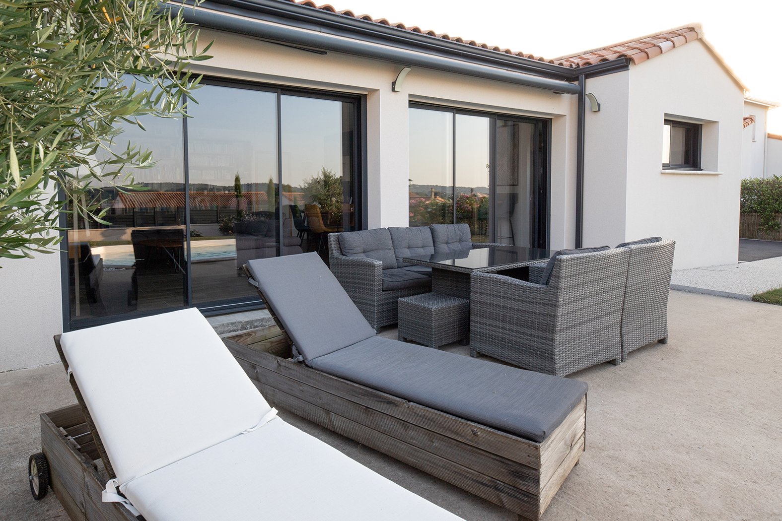 Maison de plain-pied, 4 chambres dont 1 suite parentale avec dressing, lingerie, garage de 26 m². 2 grandes baies 3 vantaux dans la pièce de vie donnent sur la terrasse, face à la piscine.