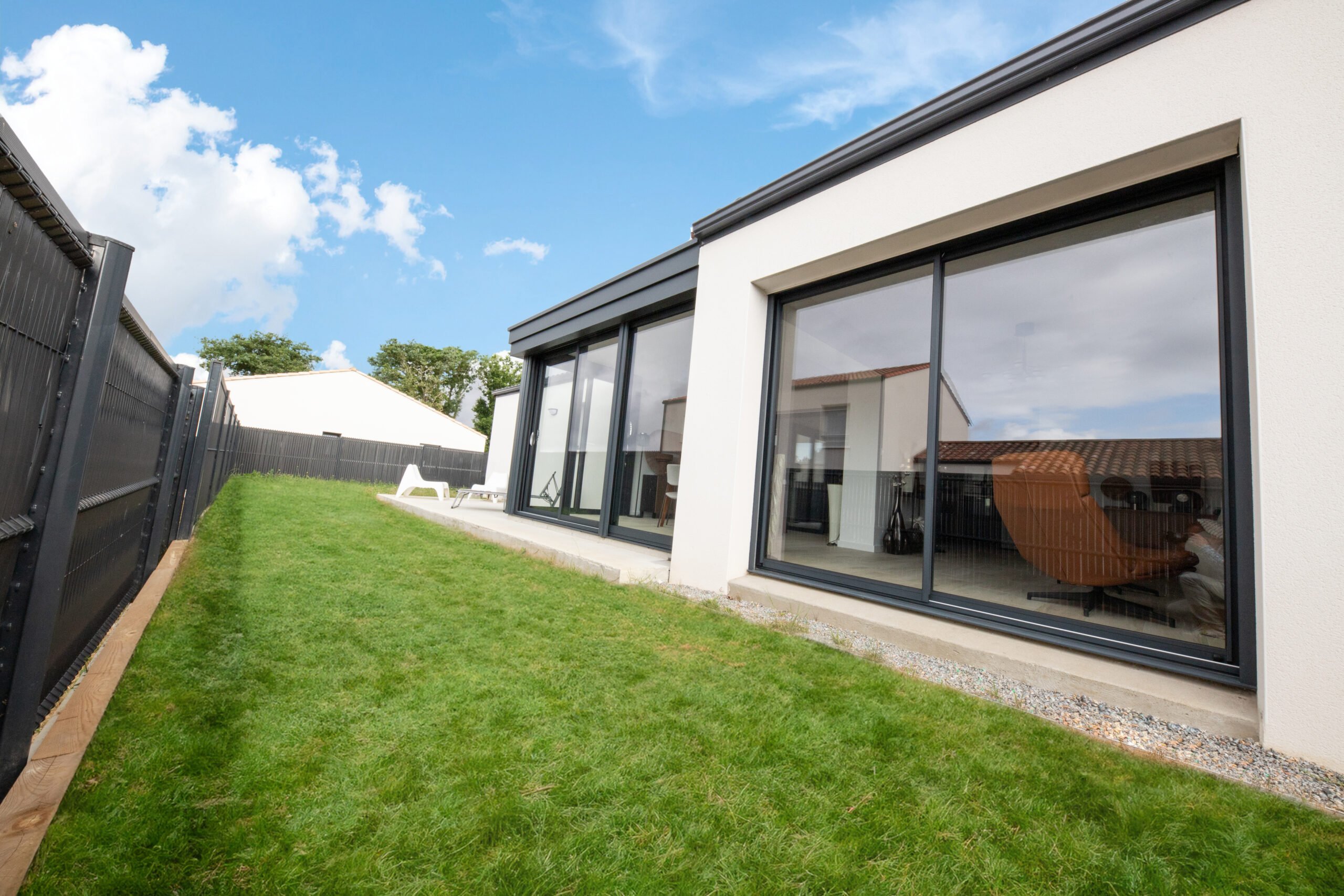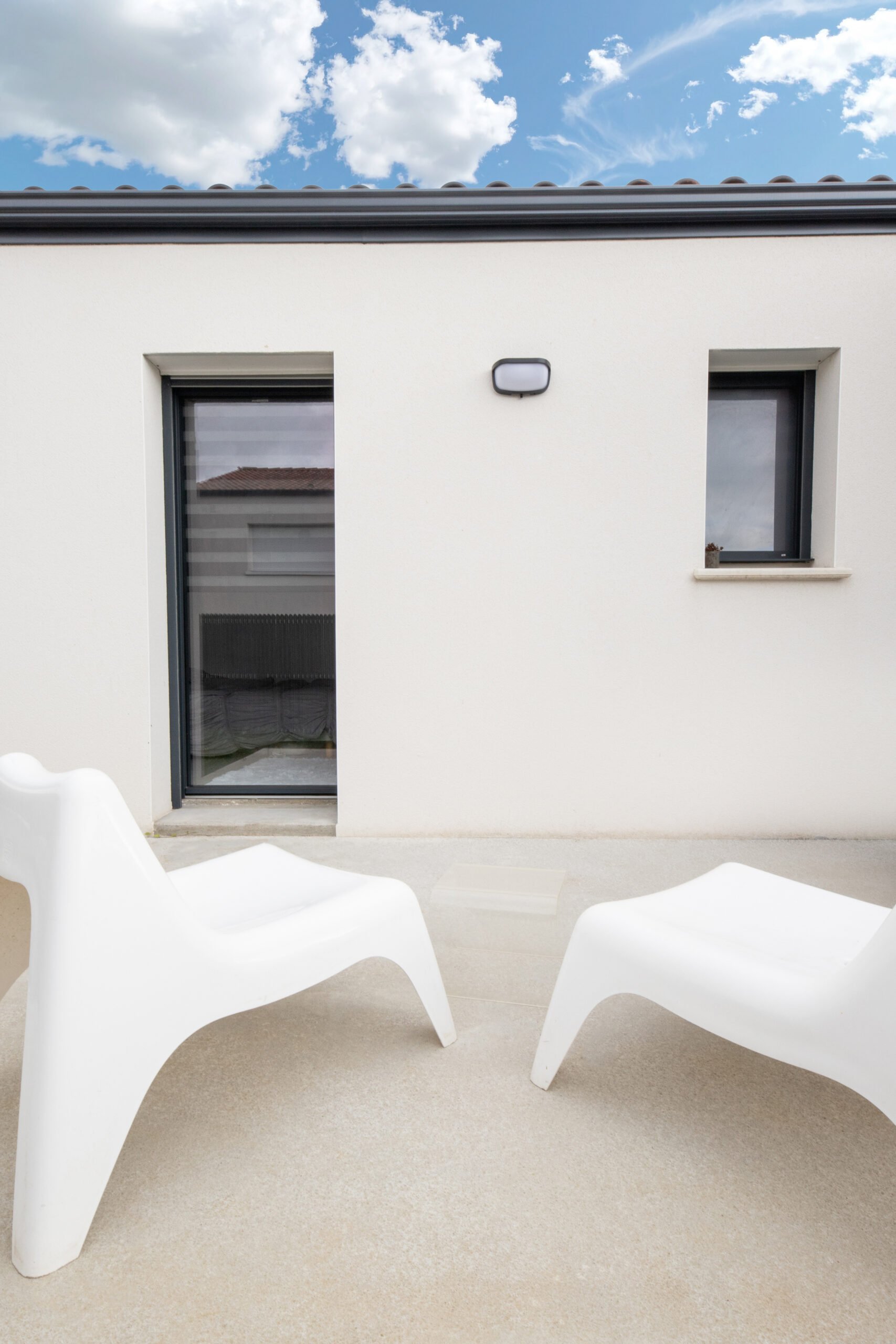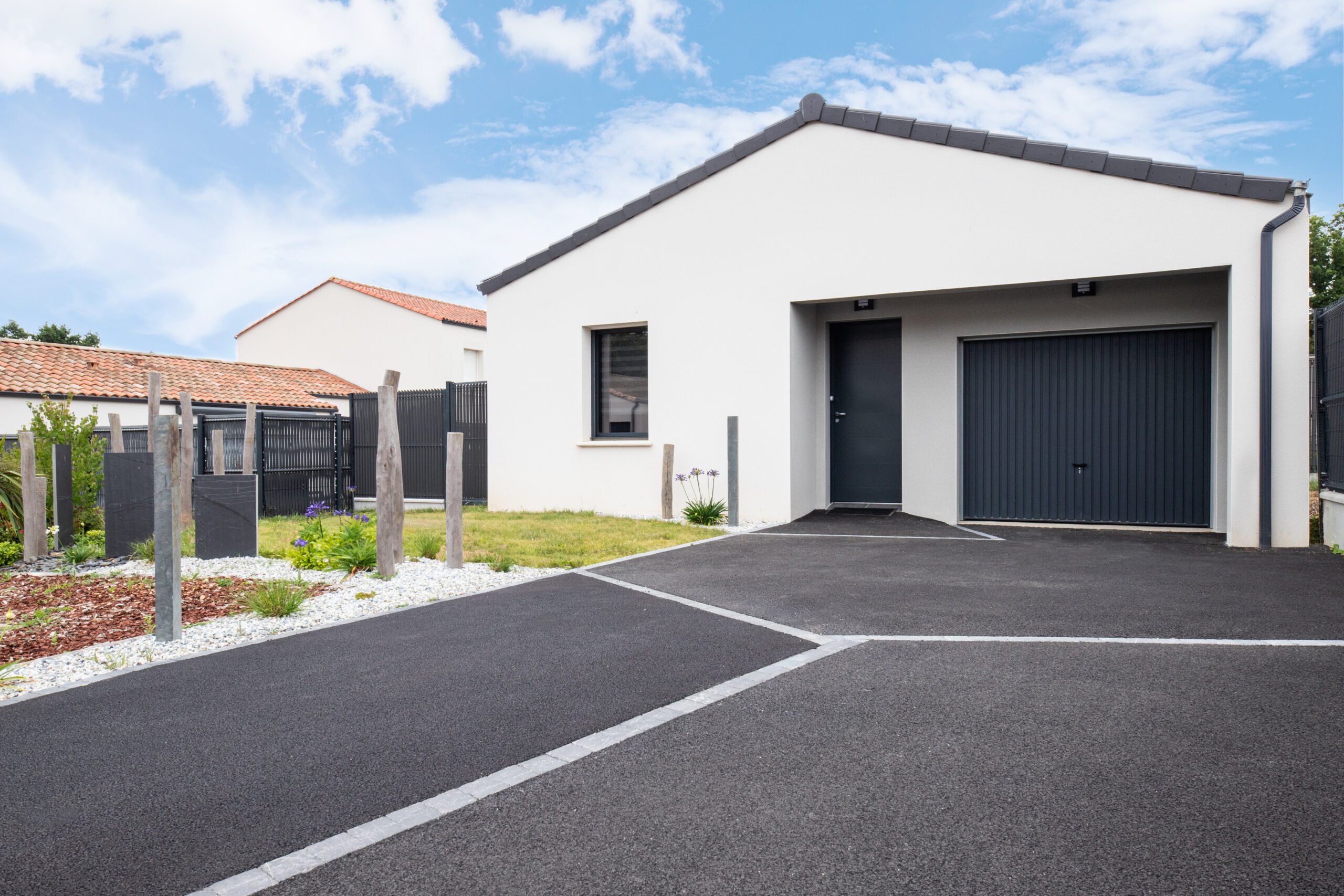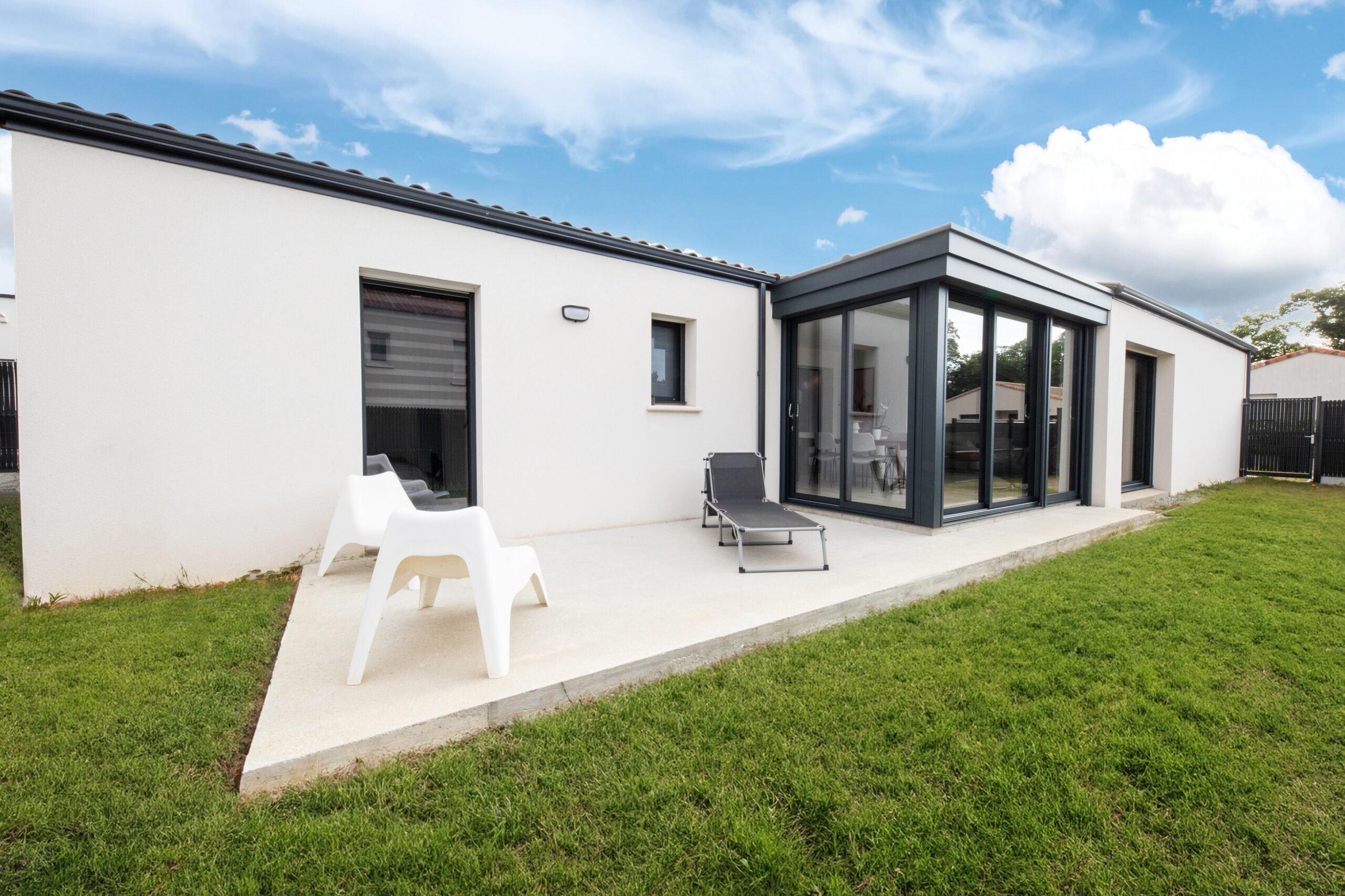Maison de plain-pied, toit tuiles noires. Belle pièce de vie, 2 chambres dont 1 avec dressing, lingerie, bureau et atelier